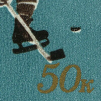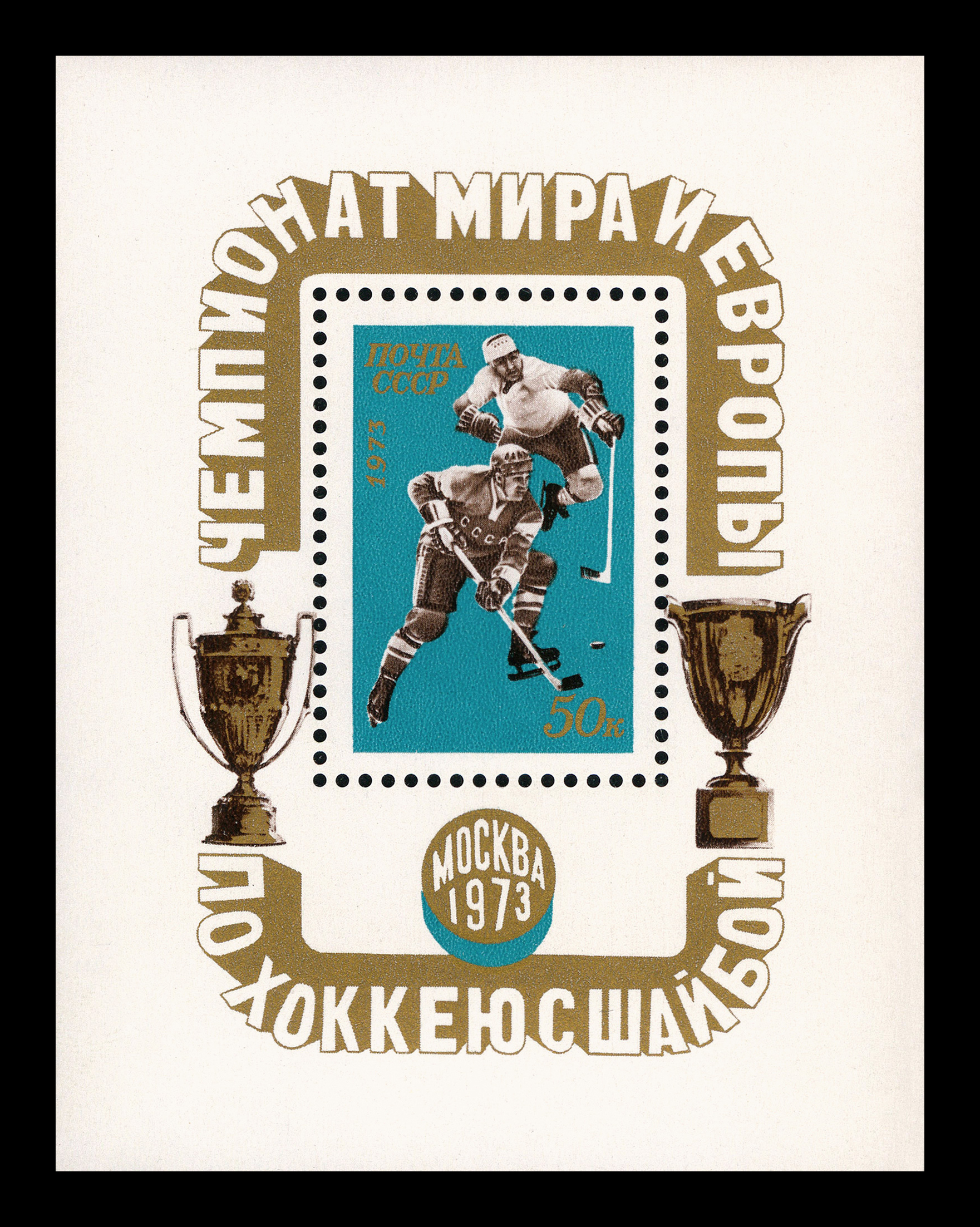 Кат. № Бл 90. Бирюзовая надпечатка "Советские хоккеисты – чемпионы мира и Европы 1973 года" на Бл 87.