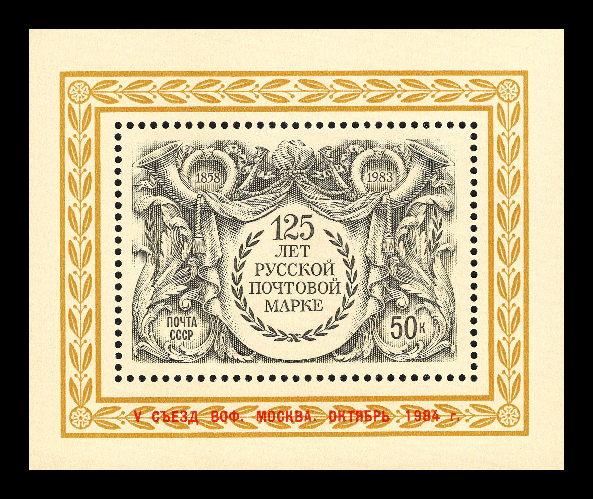 Кат. № Бл 178. Надпечатка красная на Бл 170. Печать: текста глубокая: "V Съезд ВОФ. Москва. Октябрь 1984 г.".
