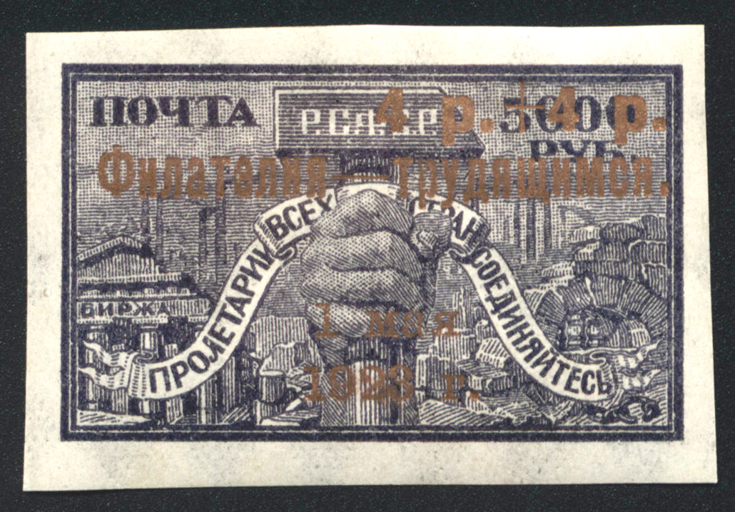 Кат. № 98. Надпечатка типографская бронзовая текста «Филателия – трудящимся. 1 мая 1923 г. » и нового номинала на марке 40. Без перфорации. Тираж – 15 000.