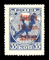 Кат. № D5. Абкляч. Надпечатка типографская кирпично-красная "ДОПЛАТА ... КОП. ЗОЛОТОМ" на марке РСФСР 1. 10 к./35 к.
