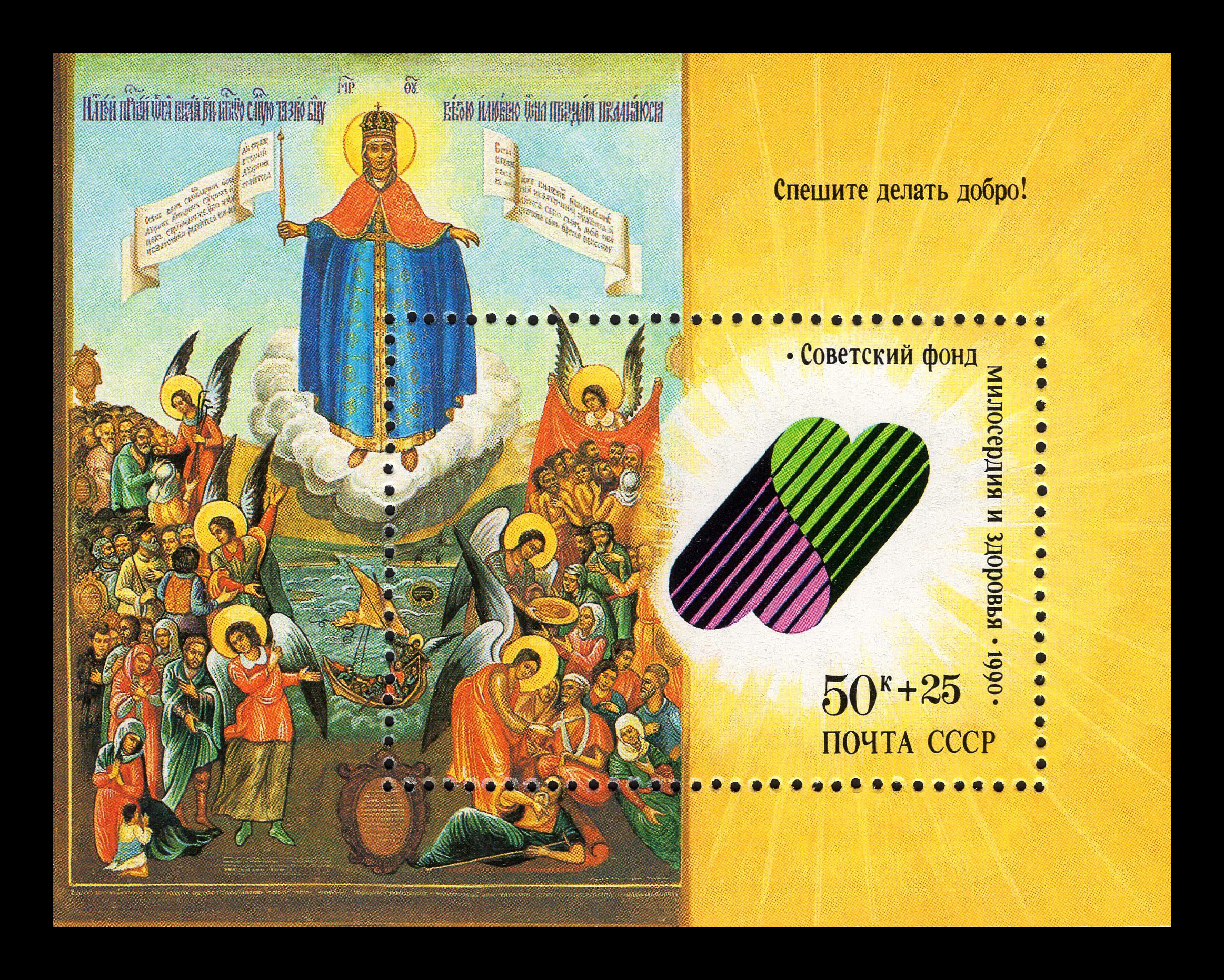 Кат. № Бл 206. Троица. Почтовый блок. Тираж – 1000 000. Печать: офсет с лакированием, серебряная паста. Перфорация рамочная 12 : 12 1/2.