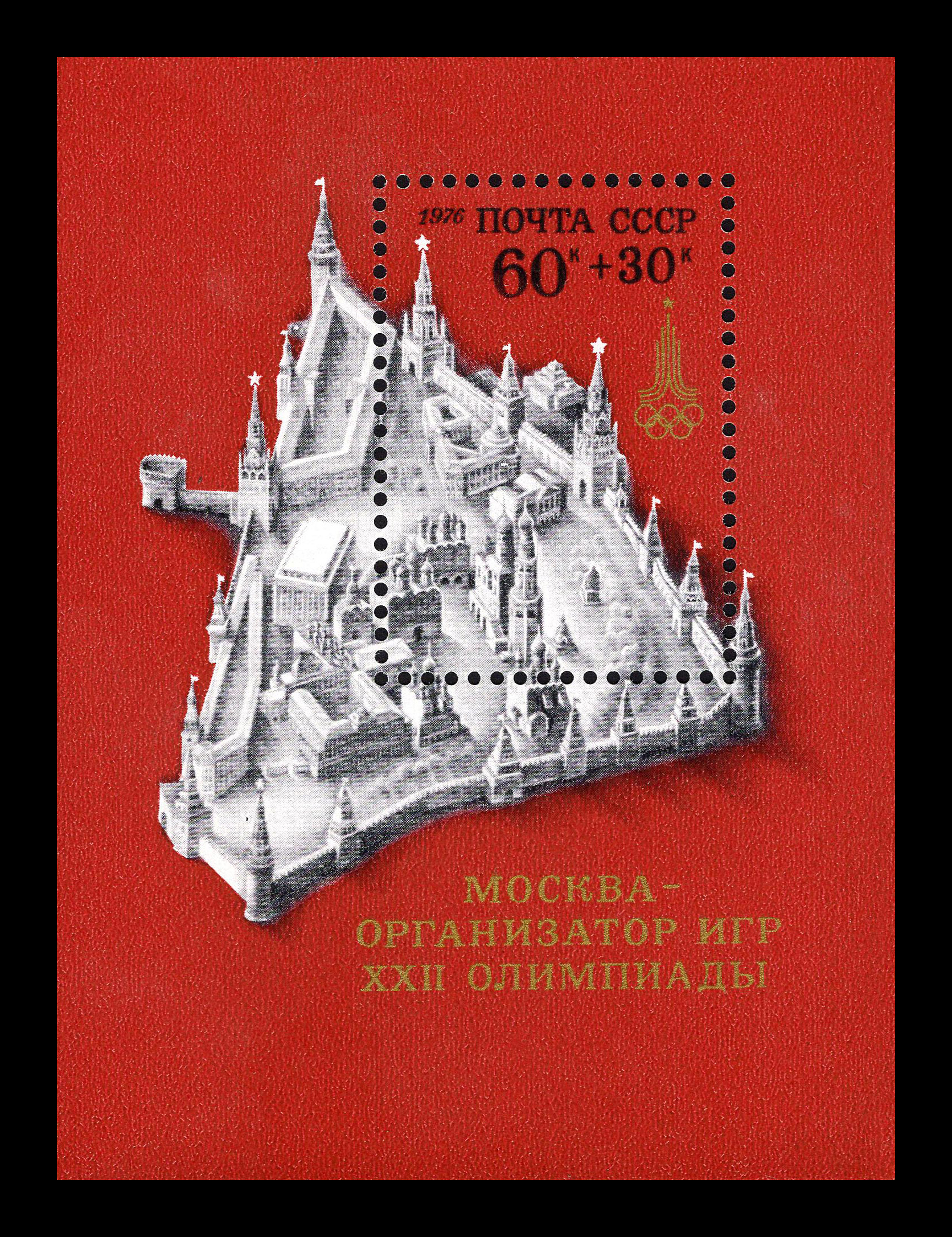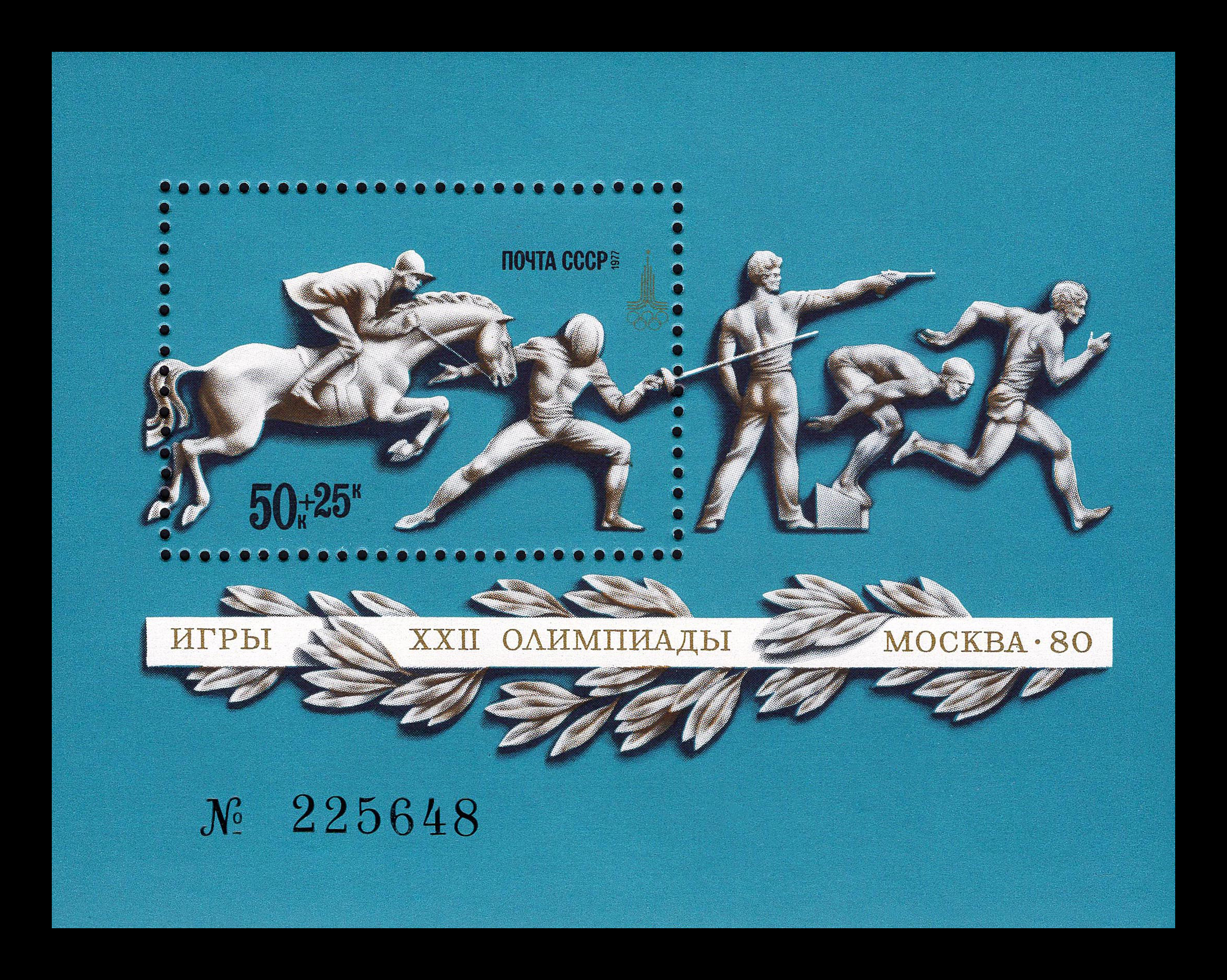 Кат. № Бл 80. Надпечатка красная глубокой печати текста "Слава Советским Олимпийцам, завоевавшим 50 золотых, 27 серебряных и 22 бронзовые награды" на Бл 80.