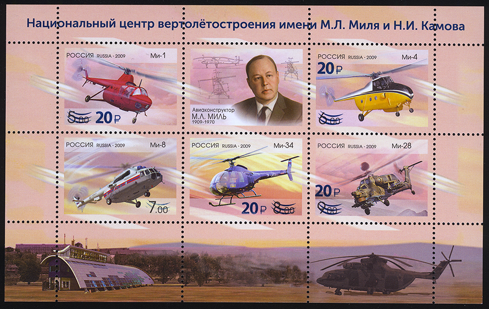 2023. 100 лет со дня рождения М.Л. Миля. Надпечатка. Лист из 5 марок и купона.